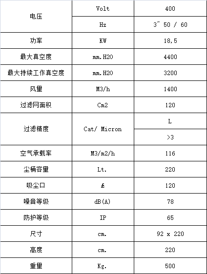 吸取的物质都将收集于带轮子的集尘箱里(220升),从而可以方便安全处理被吸的物质。如果需要,可以直接收集到垃圾袋里。整个机器安放在坚固钢铁底盘上,带两个万向轮,其中一个有制动装置,所有金属部件都是环氧喷漆的。