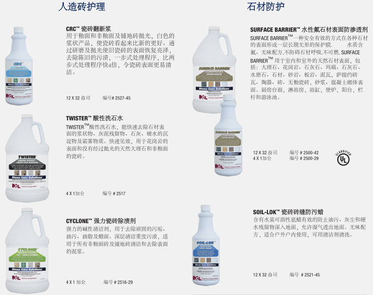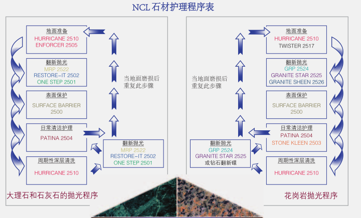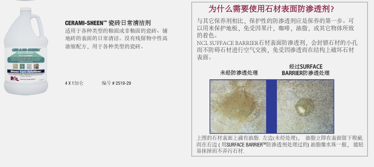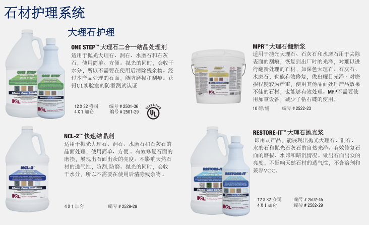 NCL的石材护理系统™对天然石材和陶瓷表面光泽的保持维护和修复是一个完整的、专业的系统。这种协调的系统在保持和修复天然石材地面,台面保持高光泽度的同时防止表面的污渍侵蚀。50多年来NCL 生产了卫生维护专业人士信任的高质量以及高性能的产品。在NCL,我们所有的创新的产品和杰出表现的系统设计的发展方向是节省您的时间,劳动强度和费用。石材护理系统™为您提供任何天然石材或瓷砖表面高性能安全,专用维护产品。这个全面的计划是专为建筑服务承包商和内部设施服务提供商设计,并不需要多年的技术经验与研磨方法!